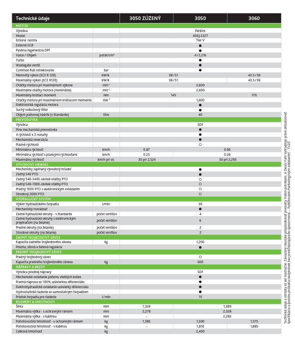 Výsledkom je nielen zníženie hladiny hluku a vibrácií a spotreby paliva, ale aj dodávka krútiaceho momentu, ktorá je optimalizovaná pre poľnohospodárske účely, komunálne aplikácie a údržbu zelených plôch. Vďaka elektronickému riadiacemu systému generuje motor inštalovaný vo verzii 3050 výkon 51 k (v prípade modelu 3060 stúpa na 59 k) bez potreby medzichladiča; to predstavuje značnú výhodu pre superkompaktné traktory, pretože zmenšuje veľkosť kapoty motora a zvyšuje efektivitu chladenia a údržby hlavného chladiča.